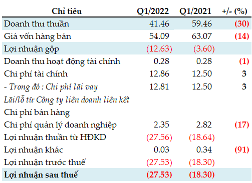 Kinh doanh dưới giá vốn khiến đơn vị lỗ gộp gần 13 tỷ đồng và lỗ ròng hơn 27.5 tỷ đồng (cùng kỳ lỗ hơn 18 tỷ đồng), do ảnh hưởng của dịch COVID-19 làm tăng các khoản chi phí. Đây cũng là quý thứ 23 liên tiếp đơn vị báo lỗ.