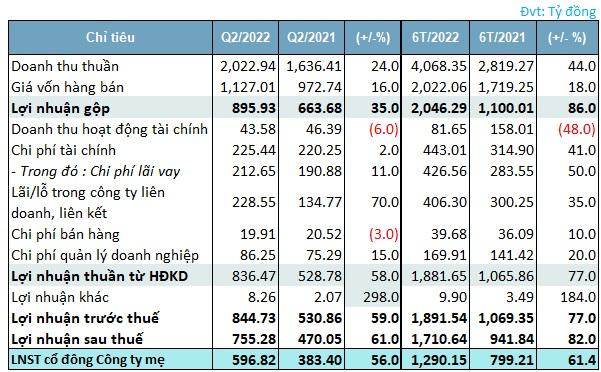 Lũy kế 6 tháng đầu năm, REE báo doanh thu đạt gần 4.07 ngàn tỷ đồng, lãi sau thuế và lãi ròng lần lượt hơn 1.7 ngàn tỷ đồng và 1.29 ngàn tỷ đồng, tương ứng tăng 44%, 82% và 61.4% so với cùng kỳ. So với kế hoạch đặt ra tại ĐHĐCĐ 2022, REE đã thực hiện được 44% mục tiêu doanh thu (9.28 ngàn tỷ đồng) và 83% kế hoạch lợi nhuận sau thuế (2.06 ngàn tỷ đồng).
