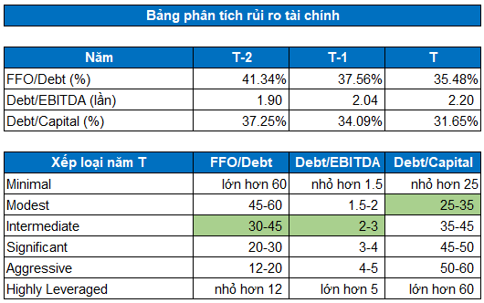Dựa trên bảng phân tích rủi ro tài chính của REE theo Standard & Poor's, FFO/Debt và Debt/EBITDA nằm trong ngưỡng Intermediate cho thấy khả năng thanh toán nợ và cấu trúc vốn chấp nhận được. Debt/Capital sát ngưỡng Modest, phản ánh tỷ trọng nợ hợp lý. Vì vậy các nhà đầu tư có thể mua vào cho mục đích đầu tư dài hạn.