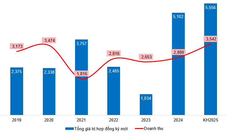 Giá trị hợp đồng ký mới và doanh thu mảng M&E giai đoạn 2019-KH2025