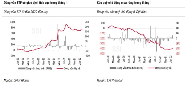 Bên cạnh đó, các giao dịch ETF (quỹ hoán đổi danh mục) cũng tích cực nhờ đóng góp từ các quỹ ngoại và dòng tiền từ các quỹ chủ động tiếp tục cải thiện. Theo đó, các quỹ ETF ngoại đẩy mạnh tăng vốn trong tháng đầu năm cũng như các quỹ mua ròng tập trung vào tuần giao dịch trước Tết Nguyên đán. Lực mua chủ yếu đến từ quỹ Fubon ETF (khoảng 1.140 tỉ đồng), hay Jih Sun Vietnam Opportunity Fund (JSV Fund) vừa huy động thêm khoảng 5.000 tỉ đồng để giao dịch trên thị trường.