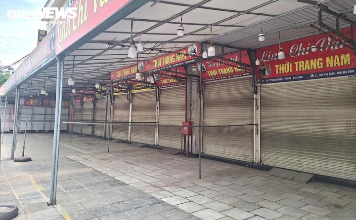 Khác với cảnh buôn bán tấp nập thường ngày, tại chợ Đọ, phường Tiền Ninh Vệ, TP Bắc Ninh nhiều sạp hàng giờ đây im lìm, cửa cuốn đóng chặt, che bạt kín mít, bên trong không một bóng người.