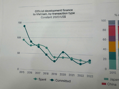 Trong khi dòng vốn tài trợ toàn cầu và khu vực giảm mạnh thì chính trong giai đoạn 2015–2023 này, Việt Nam nhận tổng cộng 49,6 tỷ USD ODF từ 80 đối tác phát triển. Con số này giúp Việt Nam đứng trong nhóm các nước nhận viện trợ nhiều nhất khu vực. Nhưng bản đồ hỗ trợ cũng thể hiện một sự đảo chiều đáng lưu ý: nếu năm 2015 Việt Nam nhận tới 9,3 tỷ USD, thì đến năm 2023 con số này chỉ còn 2,9 tỷ USD – tức giảm gần ba lần trong chưa đầy một thập kỷ.