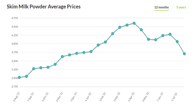 ![]() Giá sữa bột gầy có xu hướng giảm sau khi tạo đỉnh từ tháng 4/2022. Ảnh: Global Dairy Trade |