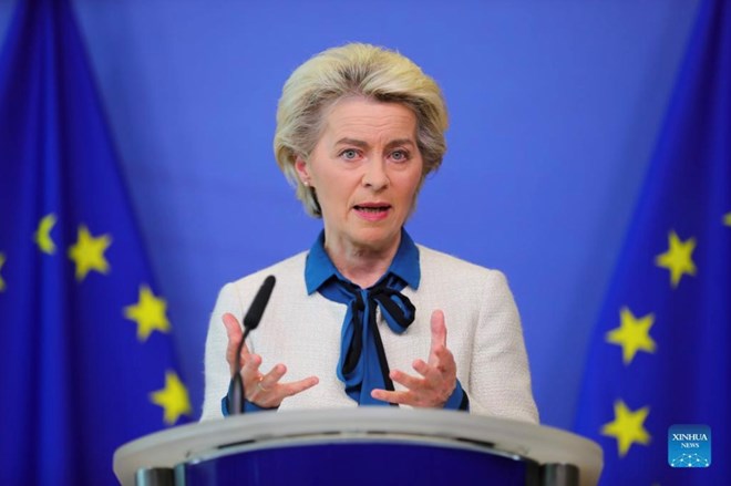 Chủ tịch Ủy ban châu Âu Ursula Von Der Leyen nhấn mạnh, châu Âu cần lắng nghe lời kêu gọi của các nước Baltic về việc xây dựng trường thành chống UAV. Ảnh: Xinhua