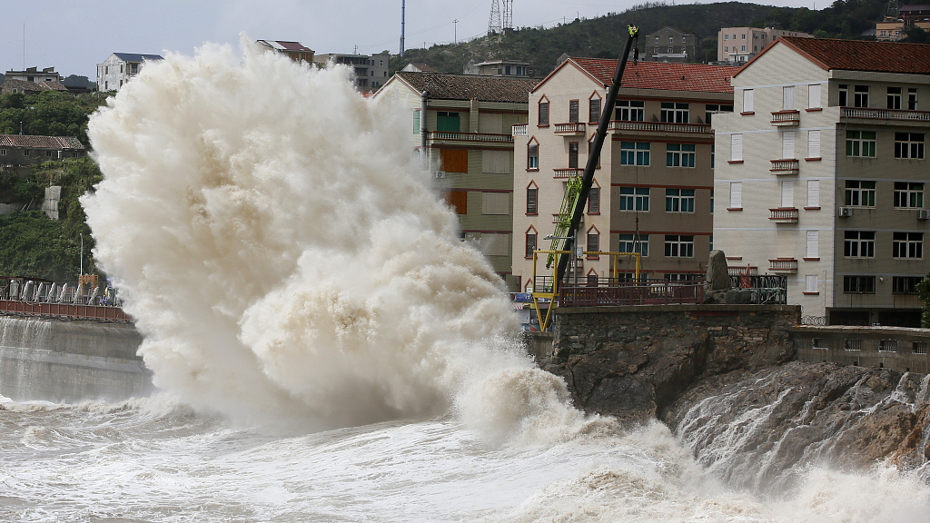 Sóng lớn do bão Khanun ở bờ biển thành phố Ôn Lĩnh, tỉnh Chiết Giang, Trung Quốc, ngày 2.8.2023. Ảnh: CGTN/CFP
