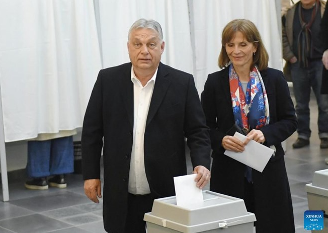 Thủ tướng Hungary Viktor Orban và Phu nhân bỏ phiếu ở Budapest ngày 12.4.2026. Ảnh: Xinhua