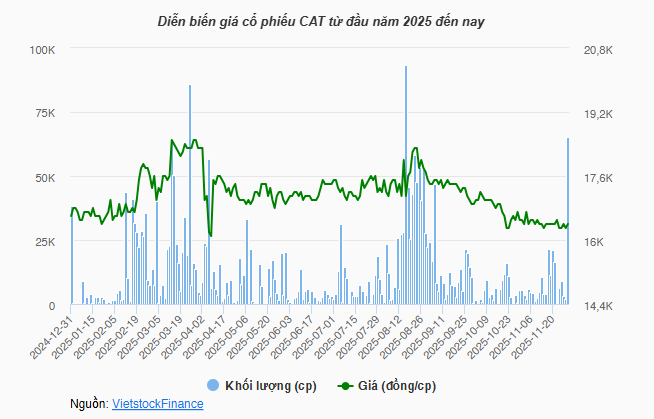 Trên sàn UPCoM, giá cổ phiếu CAT tăng hơn 4% lên 17,100 đồng/cp trong sáng 01/12, đúng thời điểm thông báo tạm ứng cổ tức, trở lại vùng giá đầu tháng 10/2025. Mức này cao hơn 41% so với giá chào bán cho cổ đông hiện hữu.