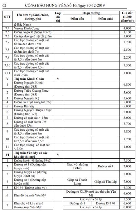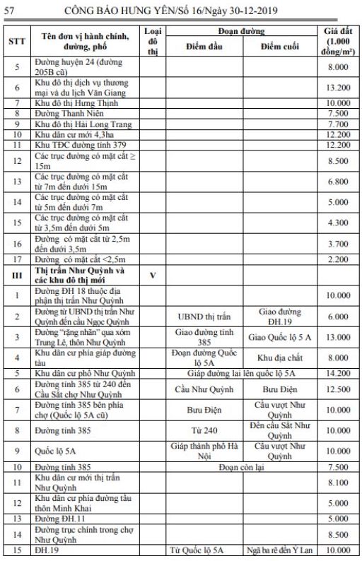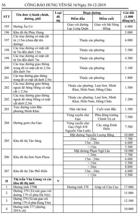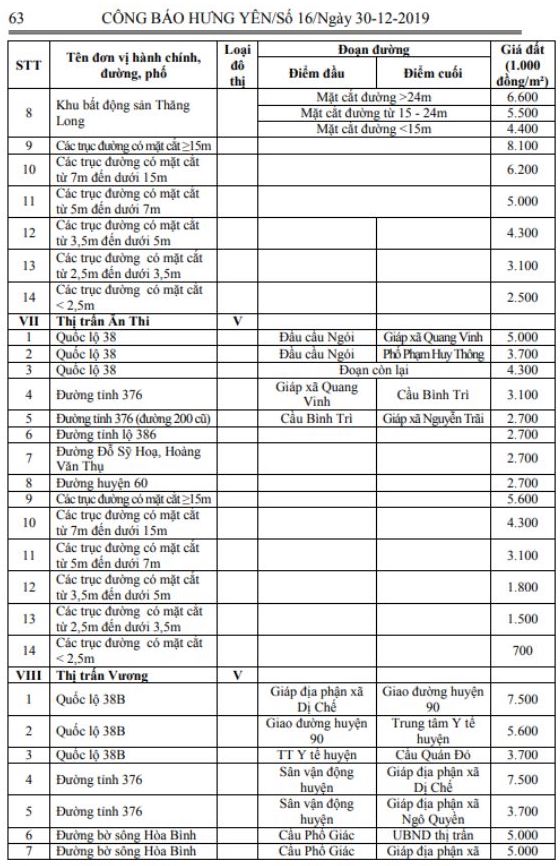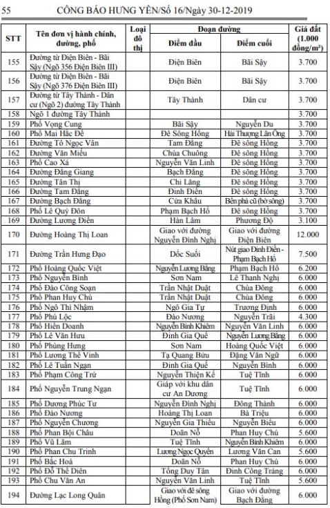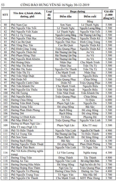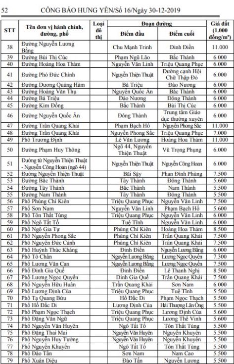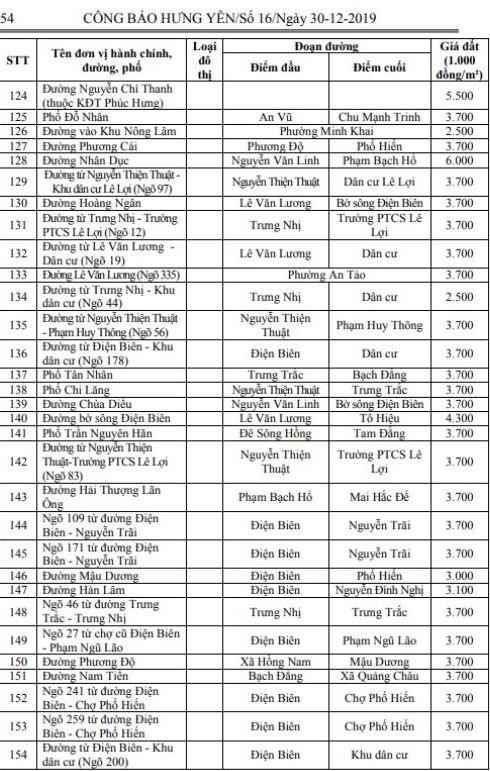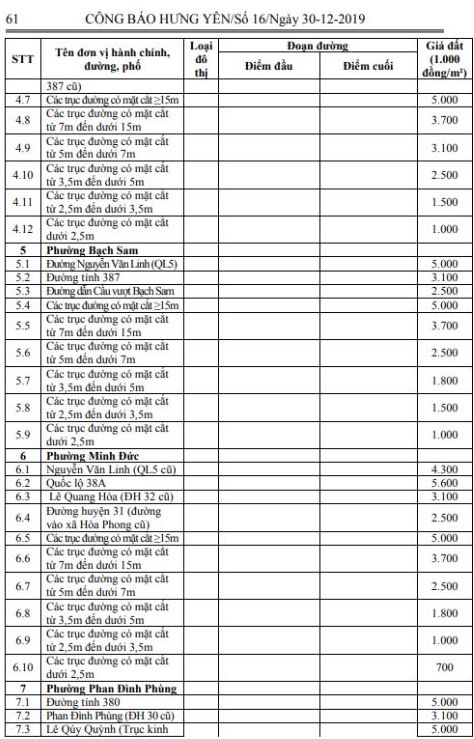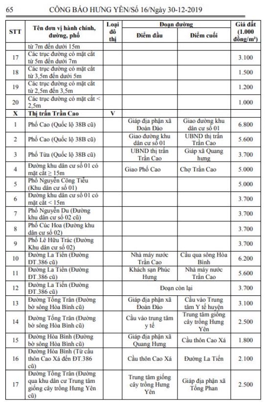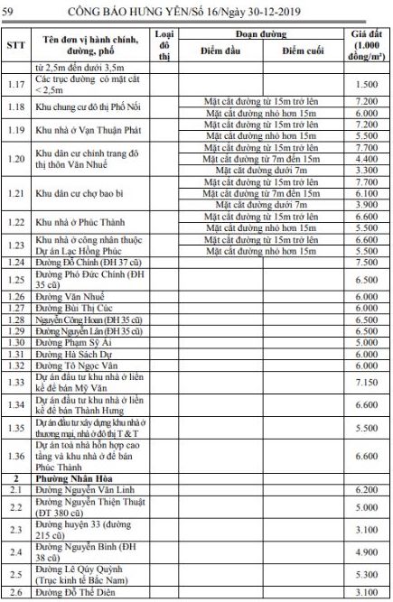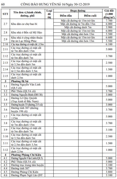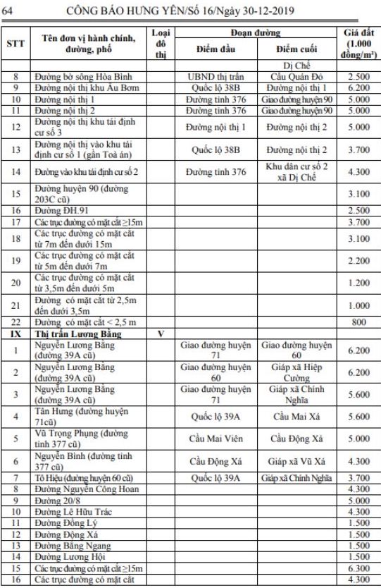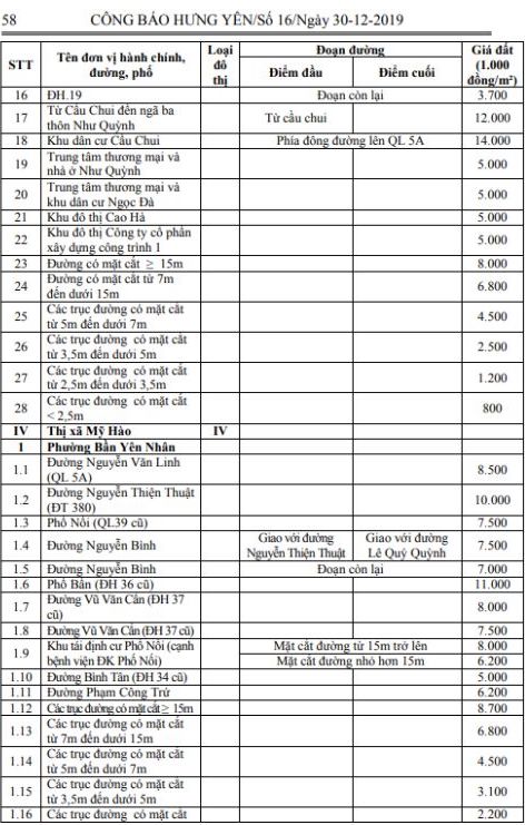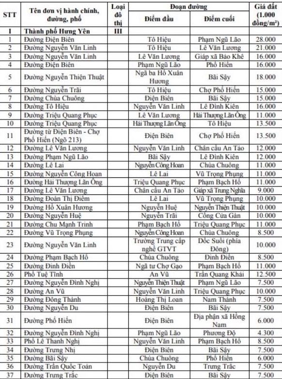 Dưới đây là bảng giá đất ở đô thị tỉnh Hưng Yên (chưa bao gồm Thái Bình sau sáp nhập):