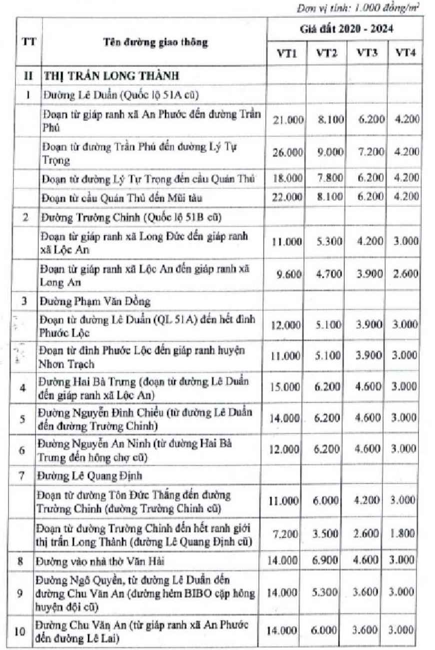 Một số tuyến đường như đường Hà Nam (từ Quốc lộ 51 đến hết ranh thửa đất số 141, tờ BĐĐC số 82 về bên phải và hết ranh thửa đất số 8, tờ BĐĐC số 82 về bên trái, phường Tam Phước), đường Phước Tân - Giang Điền, đường Hàm Nghi (từ Quốc lộ 51 đến hết ranh thửa đất số 7, tờ BĐĐC số 45 về bên phải và hết ranh thửa đất số 199, tờ BĐĐC số 30 về bên trái, phường Tam Phước) có giá từ 5 triệu đồng/m2.