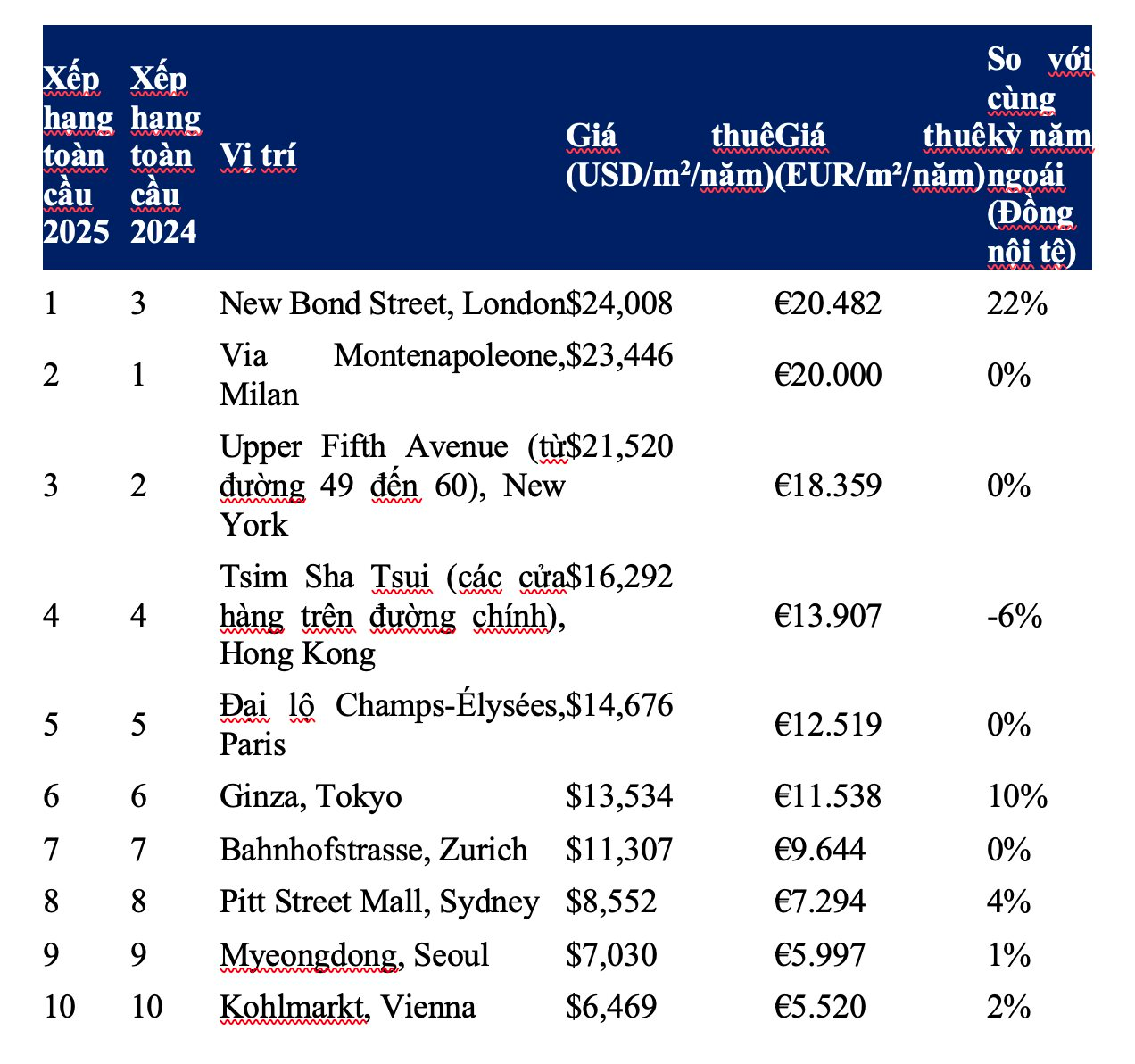 New Bond Street đã vượt qua Via Montenapoleone của Milan (23,446 USD/m2/năm), con phố đầu tiên của châu Âu đứng đầu bảng xếp hạng toàn cầu vào năm ngoái, và Upper Fifth Avenue nổi tiếng của New York (21,520 USD/m2/năm).
