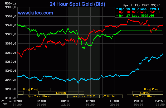 Trên thế giới, giá vàng giao ngay tạo đỉnh mới ở mức 3.350/ounce trong sáng thứ 5 (ngày 17/4) rồi sau đó có nhịp giảm và đóng cửa ở mức 3.329 USD/ounce. Phiên ngày 18/4, giá vàng tại các thị trường trọng điểm như Anh, Mỹ, Úc… đóng cửa nghỉ lễ Phục Sinh.
