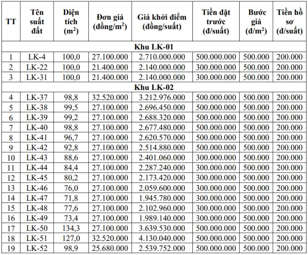 Các suất đất có diện tích từ 71 đến 247m2, tổng diện tích khu đất đấu giá 13.933m2. Giá khởi điểm từ 18,7 đến 32,5 triệu đồng/m2, tương đương hơn 1,6 tỉ đồng đến hơn 6,3 tỉ đồng mỗi suất đất.
