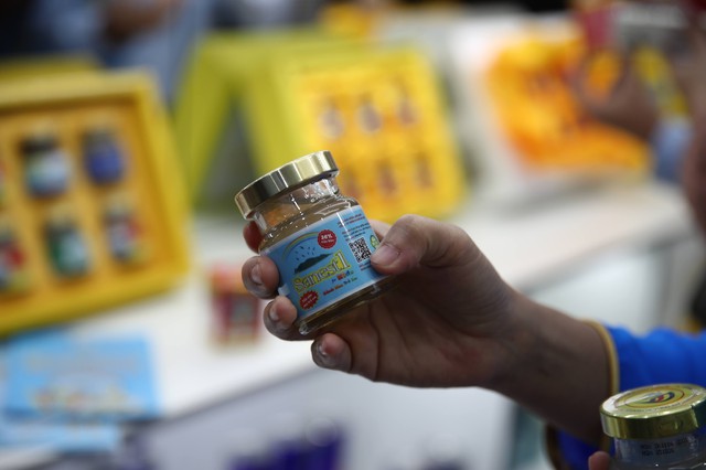 Sản phẩm yến với hàm lượng 30% nhưng thật bất ngờ giá chỉ 15.000 đồng/lọ. Sản phẩm yến sào giả này được trưng bày tại phòng triển lãm Cục Quản lý Thị trường.