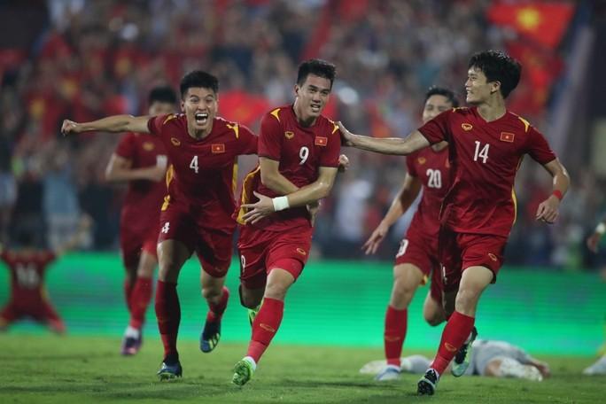 Niềm vui của U23 Việt Nam sau bàn thắng của Tiến Linh. Ảnh: HOÀNG TRIỀU