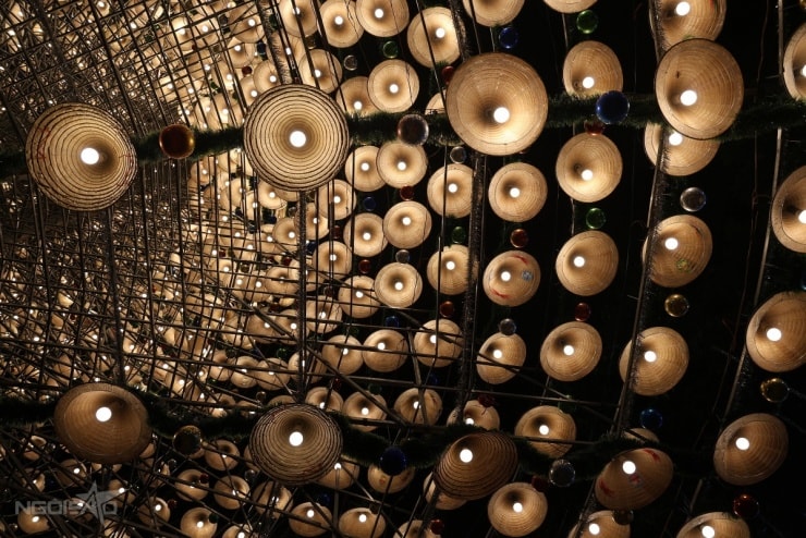 Mỗi chiếc nón lá không chỉ là vật trang trí mà còn được gắn một bóng đèn tròn cùng các quả châu màu sắc bên trong. Khi đêm xuống, hệ thống đèn đồng loạt tỏa sáng, biến cây thông thành một khối tháp rực rỡ, mang đậm bản sắc văn hóa Việt Nam giữa không gian lễ hội phương Tây.