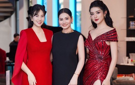 Á hậu Huyền My và BTV Mai Ngọc cùng diện đầm đỏ tại lễ kỷ niệm 11 năm thành lập thương hiệu thời trang SOHEE ở Hà Nội, tối 11/11.