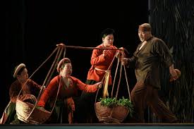 Vở diễn bắt đầu với không gian của một khu chợ nhộn nhịp nhưng hỗn độn, vang lên tiếng hòa âm của guốc mộc, lúc đều đều chậm rãi, lúc hối hả vội vàng, tựa như thứ nhạc nền dẫn lối cảm xúc của khán giả… Cùng với âm thanh độc đáo, “Hồn Trương Ba, da hàng thịt” phiên bản 2025 còn đặc biệt ở chỗ sử dụng rất nhiều chất liệu nghệ thuật truyền thống như hát xẩm, chầu văn, ả đào, chèo… kết hợp khéo léo cùng những giai điệu âm nhạc mới như hiphop, rap… tạo sức hút lớn đối với khán giả trẻ.